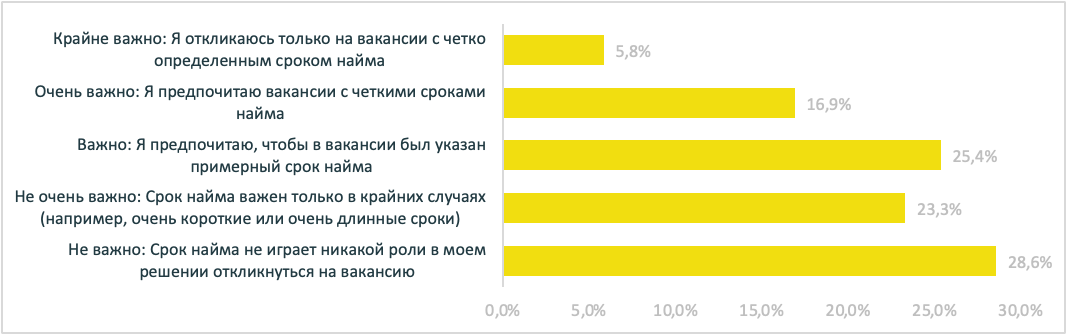 Кроме того, 23% опрошенных считают важным указать четкие сроки поиска кандидата. Это условие позволяет кандидатам лучше оценить свои шансы и ускоряет их решение о подаче отклика. Однако для половины респондентов (52%) эта информация не является критически важной.